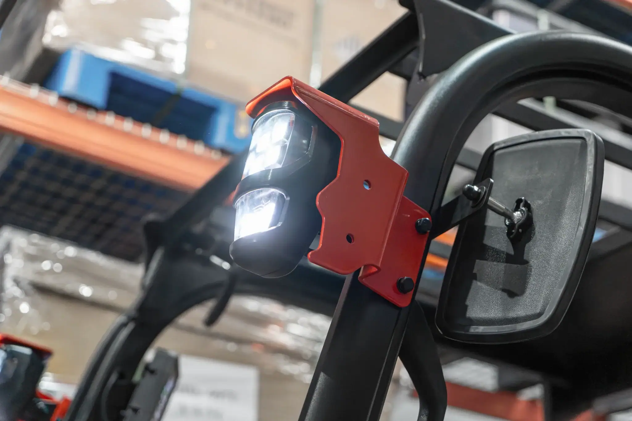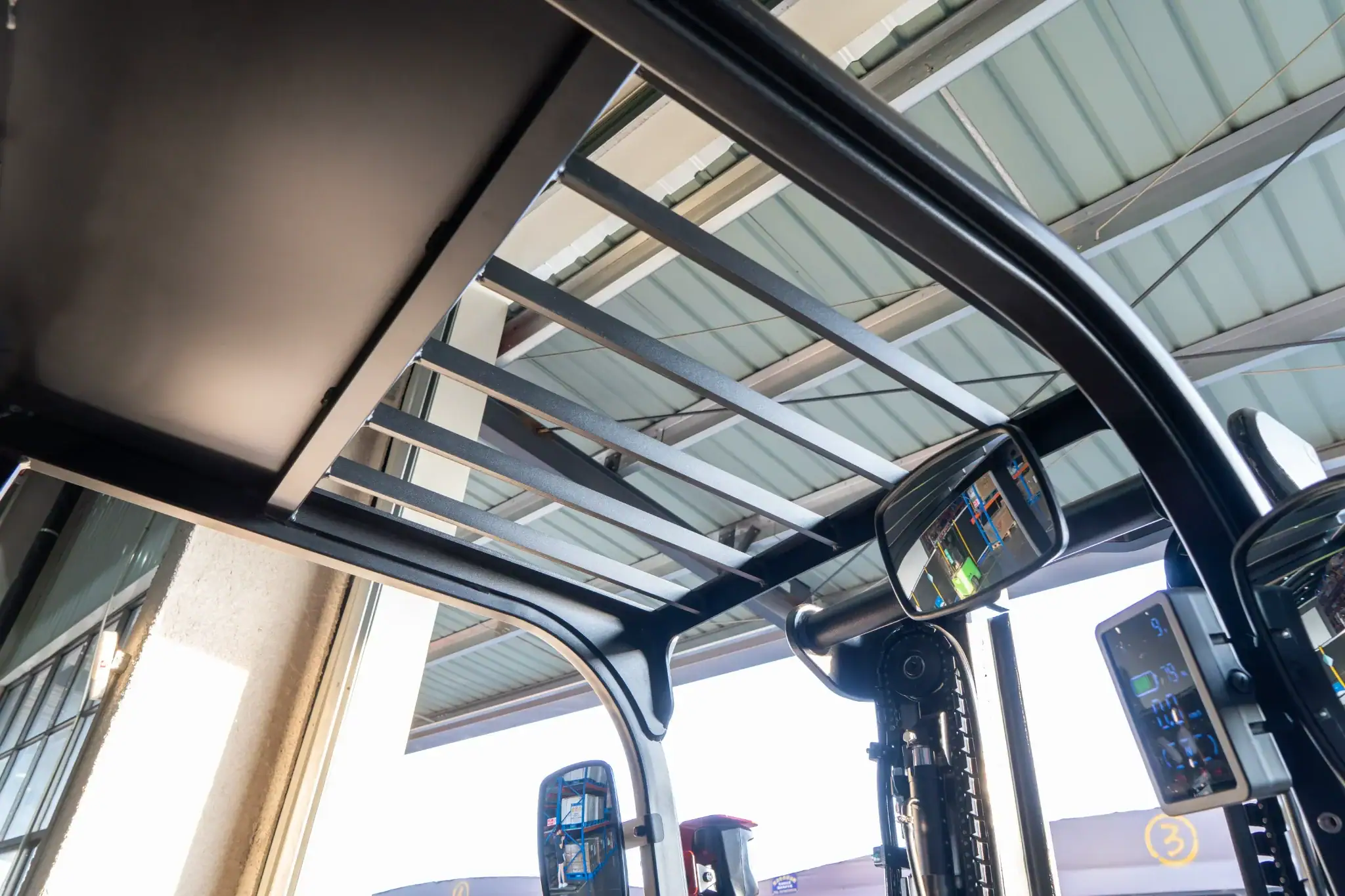 De machine beschikt over diverse geavanceerde veiligheidsopties, waaronder 'turn speed control' (automatisch afremmen in bochten), snelheidsreductie bij geheven mast en een versterkt chassis voor maximale stabiliteit bij zware lasten